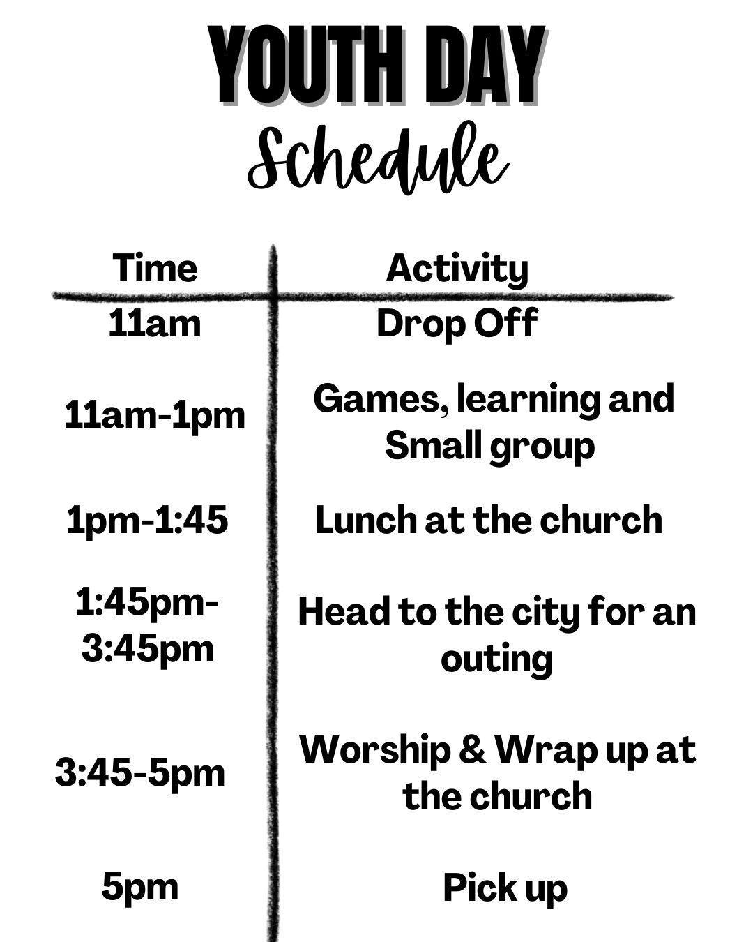 Drop-Off at the Church at 11am and Pick up at the Church at 5pm. We will be going into Winnipeg from around 1:30-3:30 (Only Youth leaders will be driving) Otherwise, we will be at the church.